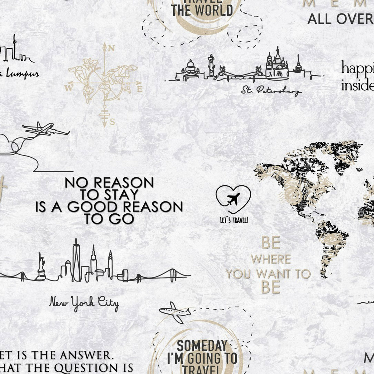 На создание новой коллекции Le Tour ТМ Ateliero дизайнеров вдохновила тема путешествий. Что может быть лучше, чем сесть в самолет, отключить мобильный телефон и электронную почту, оставить за бортом списки неотложных дел, которые никогда не заканчиваются и отправиться навстречу приключениям? Ничто так не заряжает энергией и положительными эмоциями как смена привычных «декораций» на новые – новые места, новые страны, новые знакомства, новые открытия. Легкая тематическая коллекция Le Tour наполнит ваш дом приятными воспоминаниями о прошлых путешествиях и вдохновит на новые! Коллаж из мотивирующих надписей и контурных силуэтов городов собирается в стильный, неперегруженный дизайн, поэтому мотивы можно использовать на все четыре стены. Актуальные фоны-компаньоны с текстурой штукатурки послужат отличной базой для оформления любого помещения в разных стилистических решениях. Серия представлена коммерческими колористиками серо-бежевой гаммы. Особо стоит отметить эффектную графитовую колористику, которая идеально справиться с задачей зонирования пространства и создания акцентных стен. Коллекция Le Tour универсальна, будет отлично смотреться в любом помещении – актуально в кухне-гостиной, стильно в спальне, модно в комнате подростка, креативно в прихожей. Серия прекрасно сочетается с интерьерными аксессуарами из дерева, стекла или металла. Le Tour - это отличный способ продемонстрировать свою любовь к путешествиям и исследованиям, добавив изюминку декору жилья. Мечтайте, дерзайте, путешествуйте и мир засияет новыми красками!