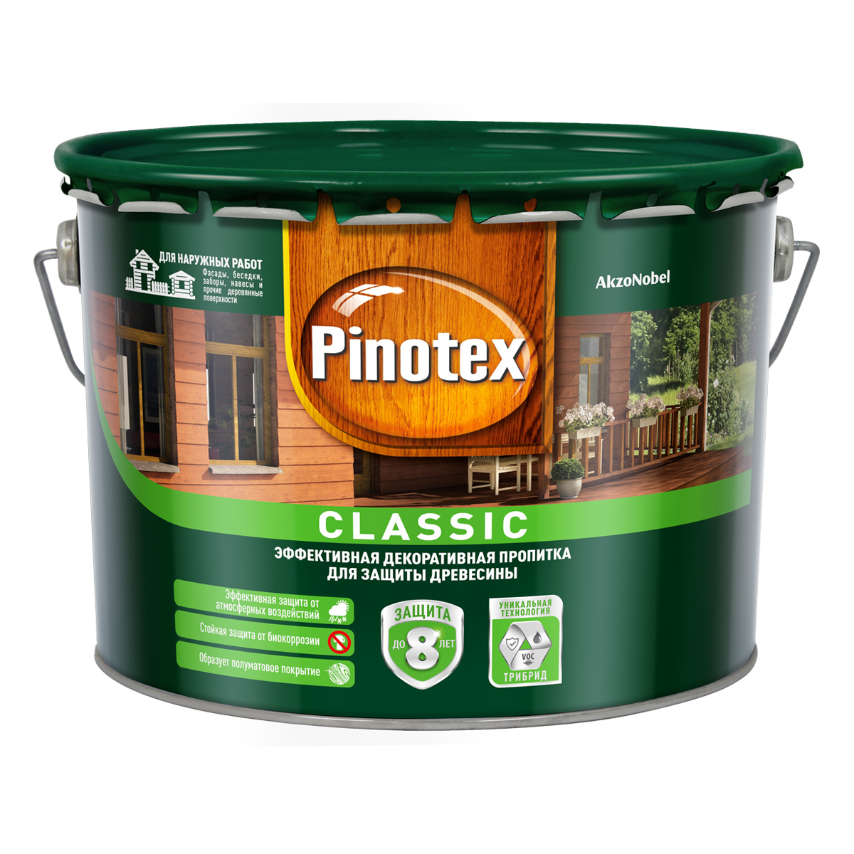 Связующее защитной пропитки разработано с использованием технологии AWB и ТРИБРИД технологии. Пропитка cодержит активные добавки против плесени и синевы. Окрашенная поверхность устойчива к воздействию солнца, дождя, снега и мороза. Pinotex Classic легко наносится и быстро впитывается в поверхность древесины, образуя полуматовое покрытие. Подчеркивает естественную текстуру древесины. Для усиленной защиты глубоких слоев древесины от биокоррозии рекомендуется применять пропитку в системе с грунтовкой Pinotex Base. Возможно применение для защиты бревенчатых строений и полукруглых облицовочных профилей.