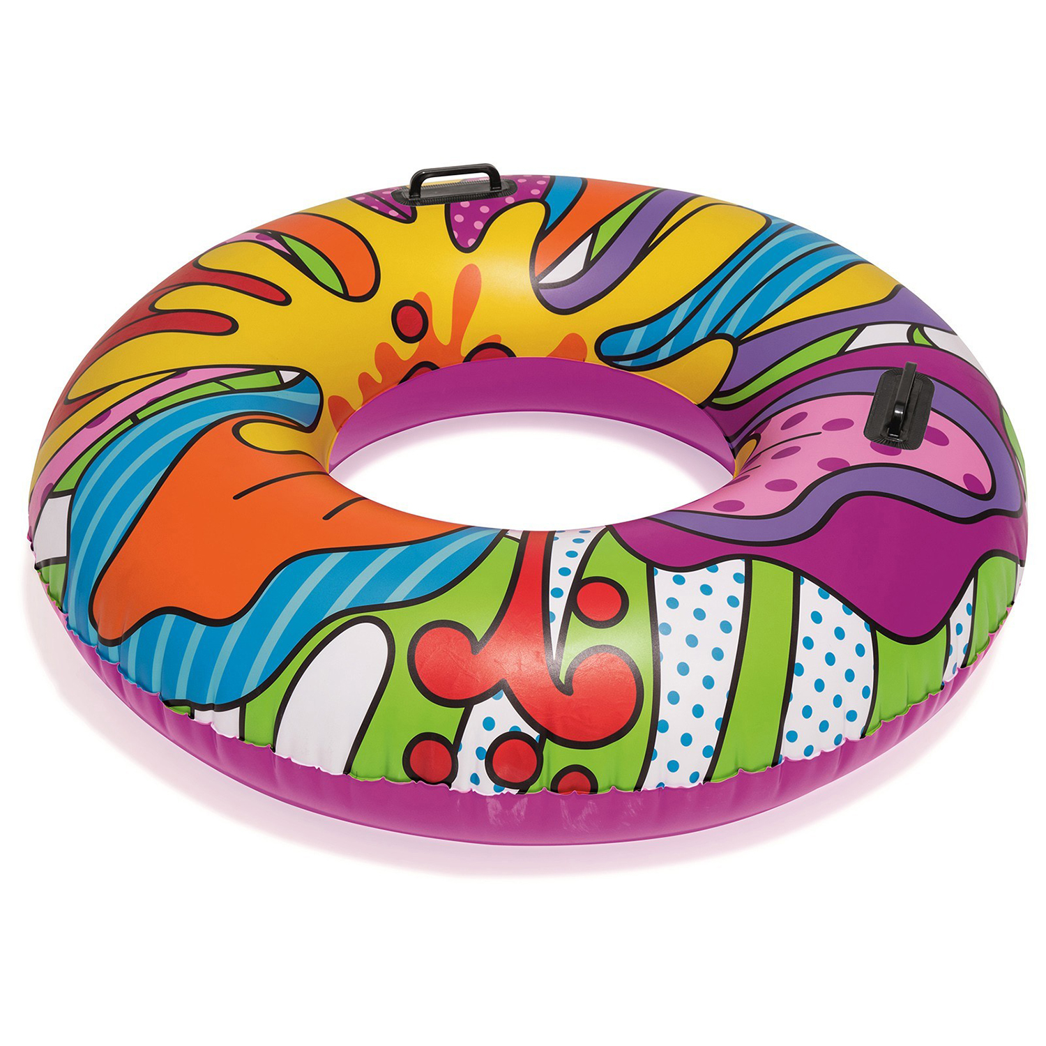 Надувной круг с ручками Поп-арт поможет комфортно и со вкусом провести время на водоеме. Принт не оставит равнодушными любителей современного искусства. Большой диаметр позволит разместиться в нем как в кресле даже взрослому человеку. Круг оборудован двумя ручками-держателями для удобства.