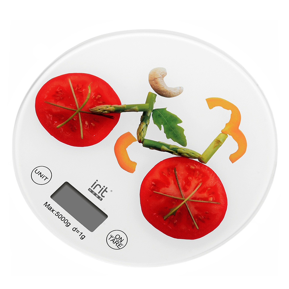 Весы кух. электрон. IRIT IR-7237 до 5кг ЖК-дисплей, круглые, рис "Велосипед из овощей" *1/40