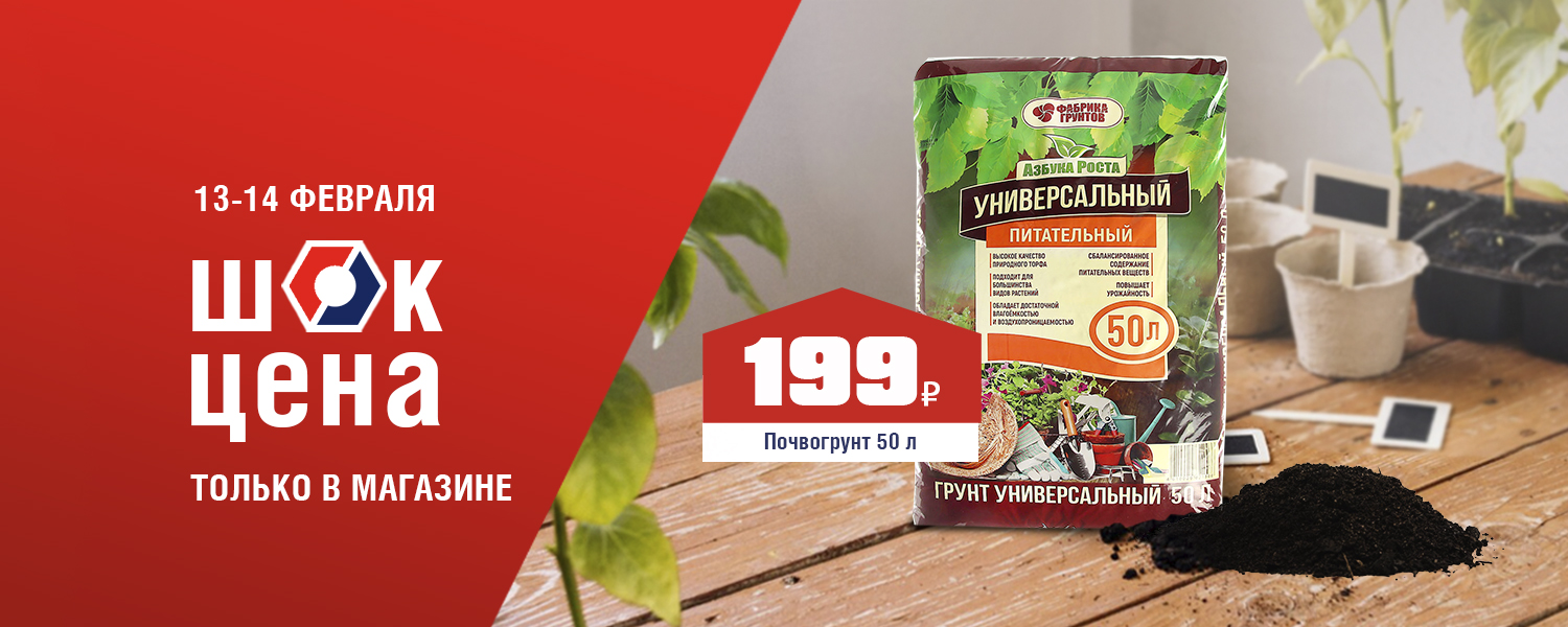 Устали от слабой рассады и поиска идеального грунта для каждой культуры? Универсальный почвогрунт — это ваше готовое решение! Сбалансированный состав и оптимальная кислотность создают идеальную основу для томатов, огурцов, перцев и цветов. Он обеспечивает здоровый старт растениям, избавляя вас от лишних хлопот и гарантируя отличный результат. 13 и 14 февраля в розничных магазинах ДомоСтрой не пропустите ШОК-цену:
